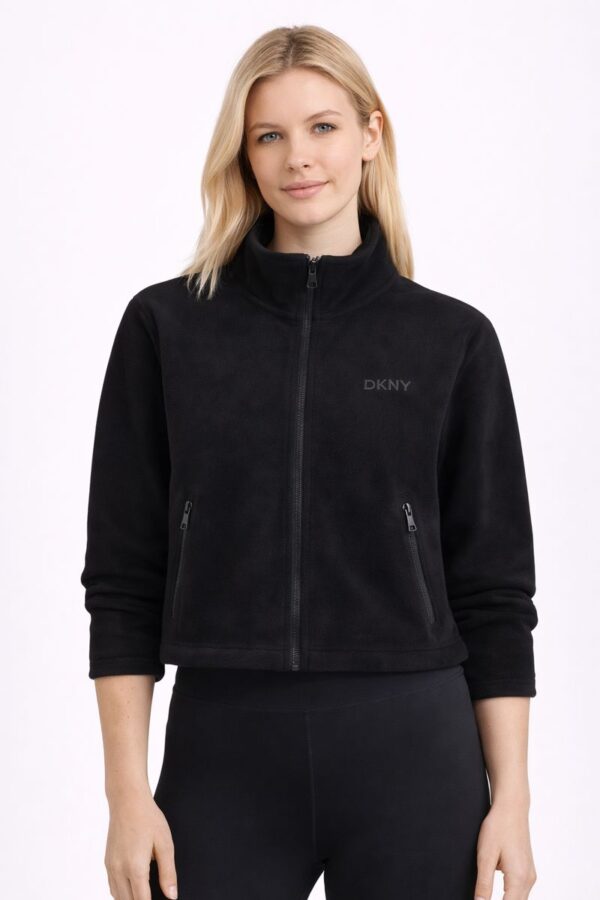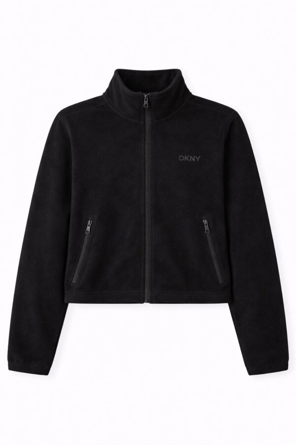 Chamarra corta DKNY para mujer en color negro, diseñada para ofrecer comodidad, abrigo ligero y un estilo moderno de inspiración urbana. Su diseño minimalista con acabado liso la convierte en una prenda versátil, ideal para complementar looks casuales o athleisure sin perder elegancia.