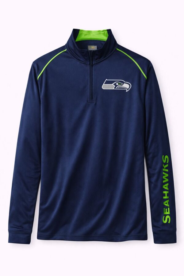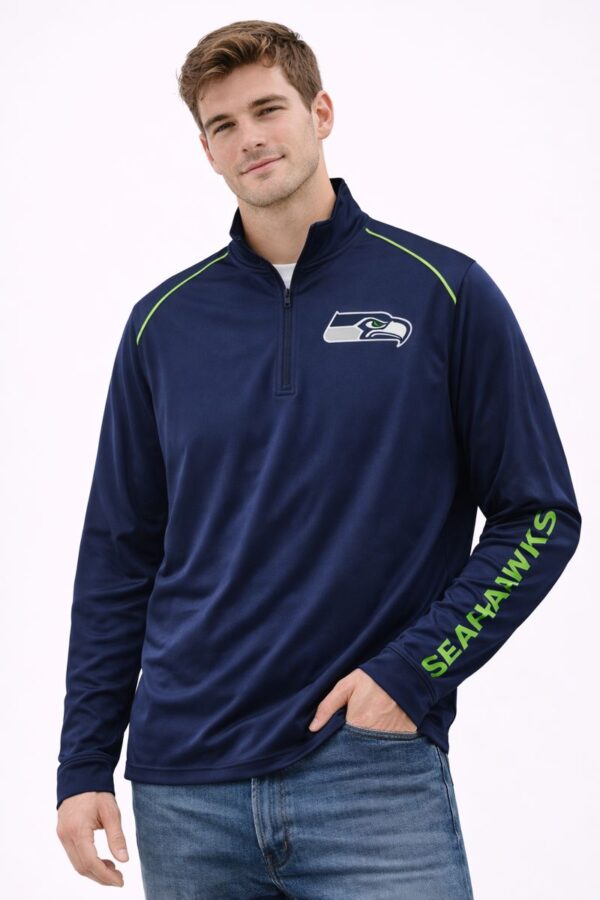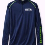 Confeccionada en tela ligera y transpirable de alta calidad, esta sudadera de manga larga proporciona confort durante todo el día. Incorpora cierre frontal corto con cuello alto para mayor protección y un diseño moderno con el logo oficial de los Seattle Seahawks al frente y el nombre del equipo en la manga, aportando un estilo dinámico y deportivo.